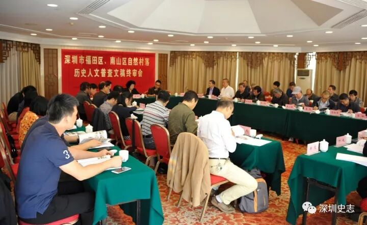 2017年12月4日,深圳市史志办公室在银湖召开深圳市福田区、南山区自然村落历史人文普查文稿终审会。市自然村落历史人文普查审查验收小组成员19人参与终审。市史志办主任黄玲、副主任王地久,地方志处业务人员,福田区、南山区史志办负责人及工作人员,两区各街道普查文稿编写人员,共40余人参加会议。会议由王地久主持。这场终审会也是市史志办组织召开的系列自然村落历史人文普查文稿终审会的最后一场。自今年3月31日召开首场评审会——光明新区普查文稿终审会以来,市史志办先后组织召开了7场终审会,完成了10个区(新区)普查文稿终审。