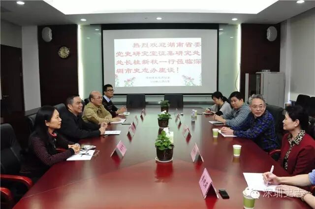 12月2日,湖南省委党史研究室征集研究处处长桂新秋、调研员李峰华等一行五人来深圳史志办考察交流工作。深圳市史志办副主任王地久接待考察组一行。双方在会议室举行了座谈会,党史处工作人员参加座谈。