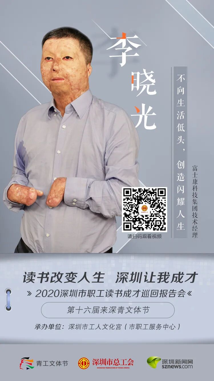 2020年深圳市职工读书成才巡回报告会!第五场巡回报告会来啦!本场报告会邀请了,富士康科技集团技术经理李晓光。今天,就由李晓光向大家分享他在深圳的这些年里拼搏、奋斗的故事。这是一个关于热爱的故事,这也是一段不向命运屈服的经历。