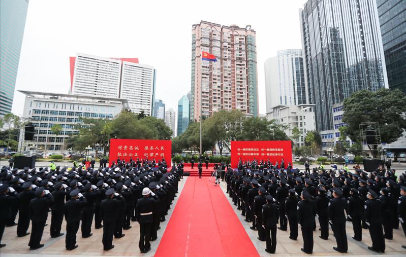10日上午8时,在深圳市公安局大院,200名民警代表面向升旗台整齐列队,10名交警铁骑分列队伍两侧。在全体人员齐唱国歌之后,仪仗队踏着正步护卫警旗入场。8点20分,中国人民警察警歌响起,随着“敬礼!”口令,全体民警同时行举手礼,齐唱警歌,注视警旗冉冉升到杆顶,飘扬在南国之滨。