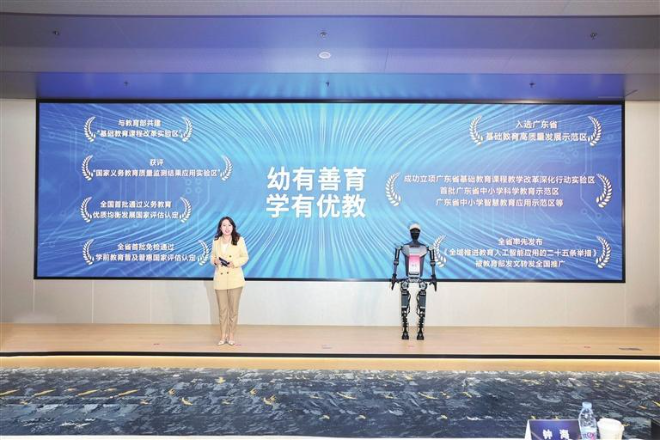 本次推介会的教育政策发布环节充满了科技元素。福田区教育局的推介并非传统的“一人讲”,而是采用了“人机协作”的创新形式。人类主持与智能机器人同台互动,共同介绍AI教育科技产业联盟的宏伟蓝图,这一创新举措不仅吸引了众人的目光,更彰显了福田区在科技应用方面的优势。