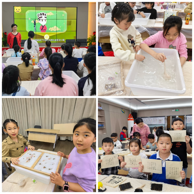 “匠心工坊”以16场非遗实践课程串联起源远流长的中华文明脉络。孩子们在造纸课上亲手体验从捣浆、抄纸到成纸的全过程,感悟古代造纸的智慧与匠心;在活字印刷工作坊中,他们用矿物颜料拓印古诗,体验千年文字传承的工艺魅力。
