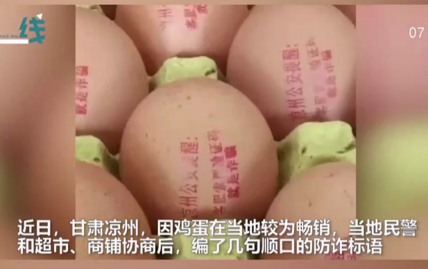 北京青年报2021年4月28日消息(记者 张夕)近日,“甘肃省武威市凉州区公安局在鸡蛋上印反诈骗标语”的视频在网络上传播,获得网友好评点赞。据悉,这样的“反诈蛋”已印了1000多枚,当地市民在买鸡蛋和用鸡蛋时,都能看到警方的反诈骗标语。