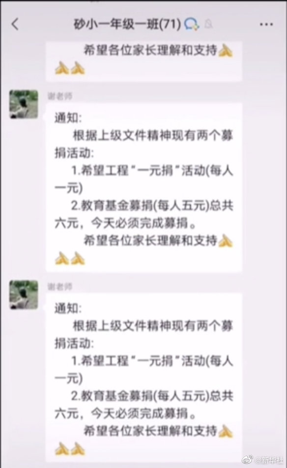 @新华社5月20日消息,近日,湖南省湘西土家族苗族自治州永顺县一名教师让未参加捐款的学生排队录像,并将视频发至家长群中,动员学生家长募捐。永顺县教育和体育局回应,经查,本次募捐是由永顺县教育基金会发起,募集款项将全部用于奖励优秀师生和教育工作者、救助有特殊困难的师生以及开展“园丁之家”等公益慈善活动。事后,经批评教育,涉事教师向家长和学生道歉。目前,经永顺县教体局局务会研究决定,对砂坝镇中心完全小学教师谢某某进行行政记过处分,调离该校;对校长彭某某就地免职;对永顺县教育基金会工作人员覃某某进行诫勉谈话;对砂坝镇中心完全小学在全县进行通报批评。