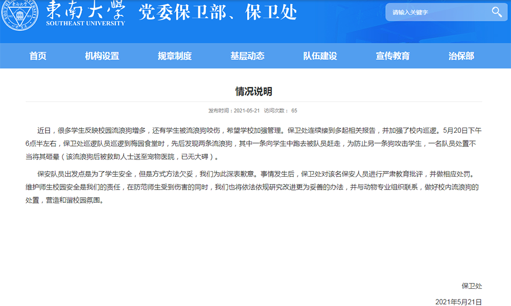 针对“保安用石头砸流浪狗”一事,5月21日,东南大学官网发布“情况说明”称,事发后,保卫处及物业保安公司已对该名保安人员进行严肃教育批评,并做相应处罚。