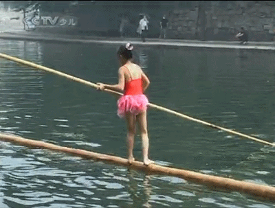爬上竹竿,尝试站立,掉落水中,又爬上竹竿,尝试站立,复又掉落水中……如此反复,历经多次失败、挫折后,她才逐步掌握门路。