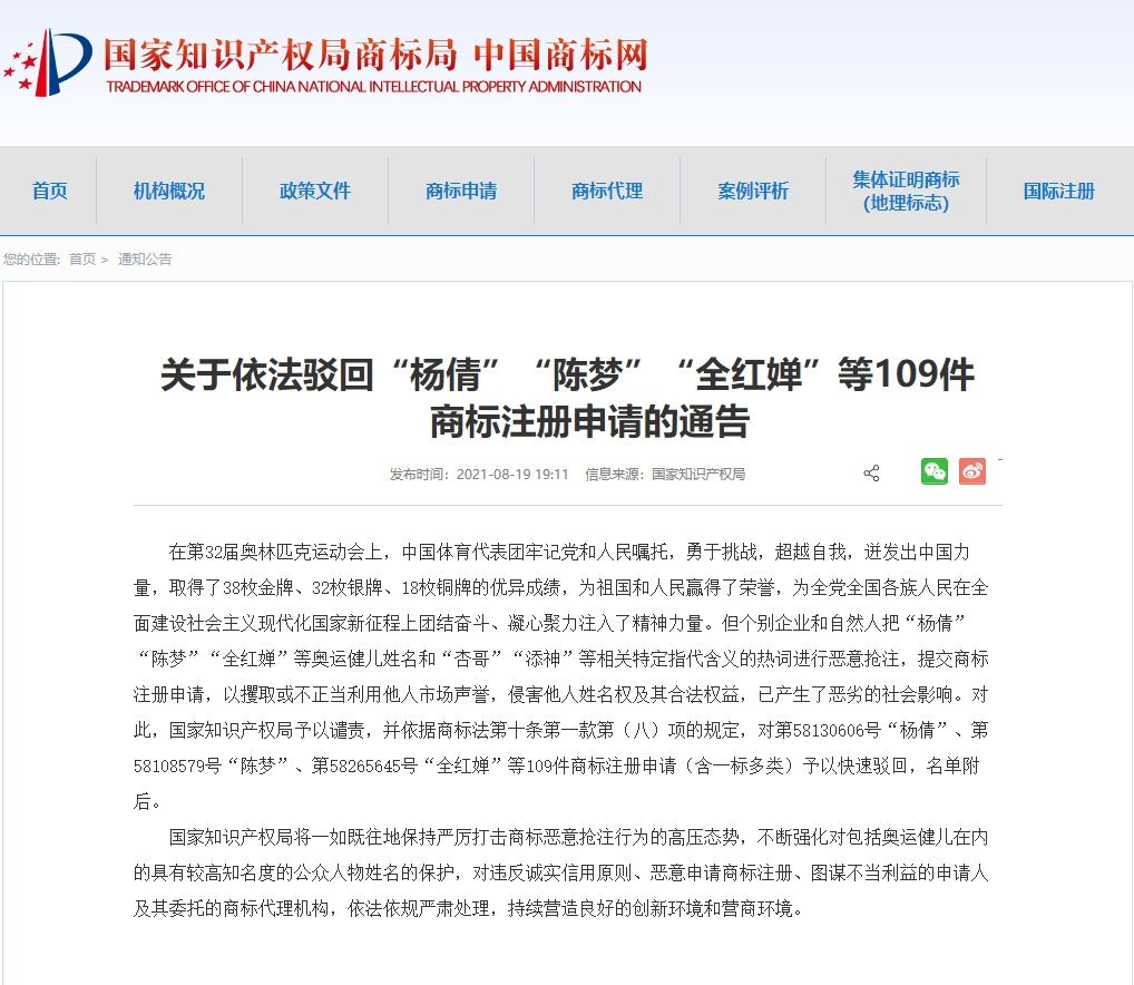 在第32届奥林匹克运动会上,中国体育代表团牢记党和人民嘱托,勇于挑战,超越自我,迸发出中国力量,取得了38枚金牌、32枚银牌、18枚铜牌的优异成绩,为祖国和人民赢得了荣誉,为全党全国各族人民在全面建设社会主义现代化国家新征程上团结奋斗、凝心聚力注入了精神力量。但个别企业和自然人把“杨倩”“陈梦”“全红婵”等奥运健儿姓名和“杏哥”“添神”等相关特定指代含义的热词进行恶意抢注,提交商标注册申请,以攫取或不正当利用他人市场声誉,侵害他人姓名权及其合法权益,已产生了恶劣的社会影响。对此,国家知识产权局予以谴责,并依据商标法第十条第一款第(八)项的规定,对第58130606号“杨倩”、第58108579号“陈梦”、第58265645号“全红婵”等109件商标注册申请(含一标多类)予以快速驳回,名单附后。