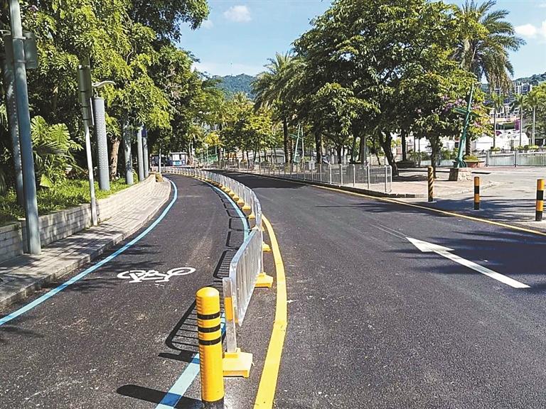 以宋彩道-盐梅路路口为例,这条道路正是因为盐梅路(大梅沙海滨公园段)已实施下沉,该路口的交通组织发生了变化,无法从宋彩道右转进入盐梅路。市交通运输局盐田管理局根据实际情况,将宋彩道-盐梅路路口从原有的双向通行调整为单向,并结合宋彩道人行道过窄、无自行车道情况,利用原有机动车道设置了非机动车道。这一变化赢得了周边居民和游客的点赞。每天通行此路的刘女士明显感受到交通环境的变化,她表示,原来骑电动车通过这一路段时,要么骑行在拥挤的人行道上,要么骑行在机动车道上,如今有了专用的非机动车道,骑车出行感到更加安全。
