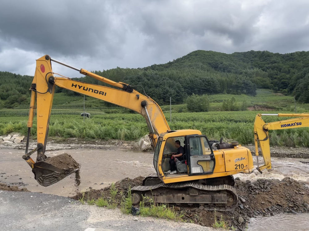 8月10日下午,在黑龙江省尚志市,沿河修建的石头河子镇至宝山村乡级公路的修复工作正在进行。记者在现场看到,两台挖掘机不断将河中的砂石挖出,再堆放至路基处,逐步修复破损的路肩和边坡。