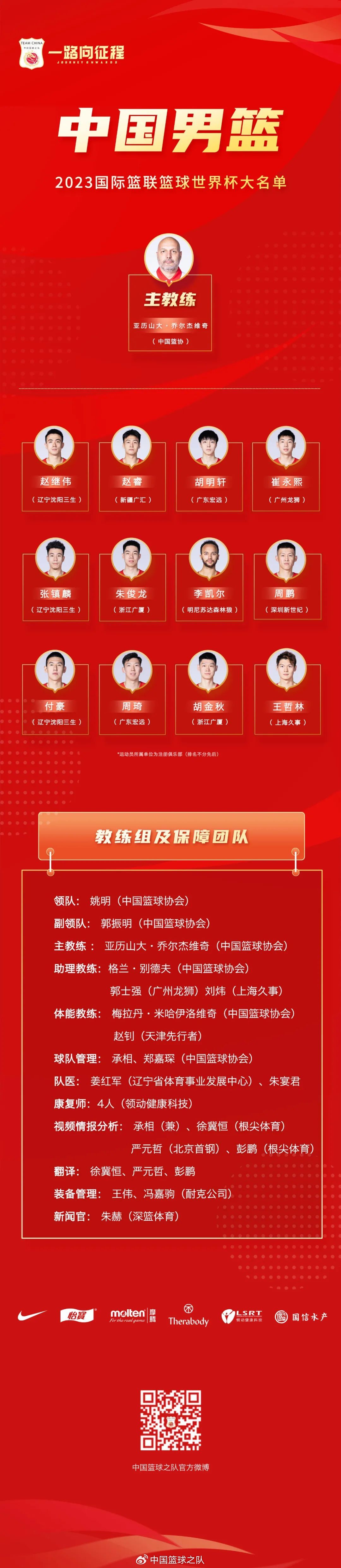 8月22日晚,中国男篮世界杯12人大名单正式确定:周琦、李凯尔、胡明轩、赵继伟、朱俊龙、赵睿、周鹏、王哲林、崔永熙、胡金秋、付豪、张镇麟。