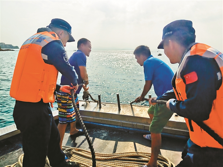 ▲海警执法员帮助渔船民加固缆绳。 受访单位供图