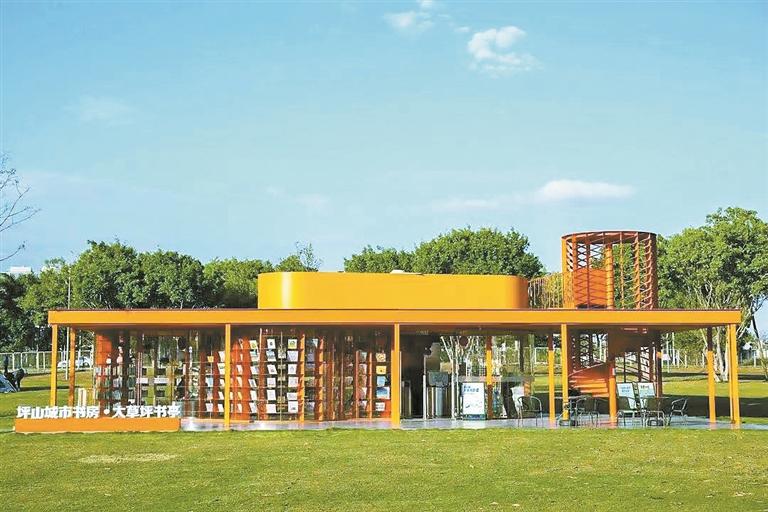 在坪山区中心公园,一个橙色的大草坪书亭引人注目,亭内几名读者安静地在书架上选书。窗外蓝天绿草,窗内书香氤氲,读者低头抬眼间便可领略自然与人文交融之美。这里既是家门口的靓丽风景,也是居民们的“精神粮仓”。“一来到这里,孩子不由得就安静下来,我们经常一呆就是一下午,真是享受。”附近居民郑女士说。