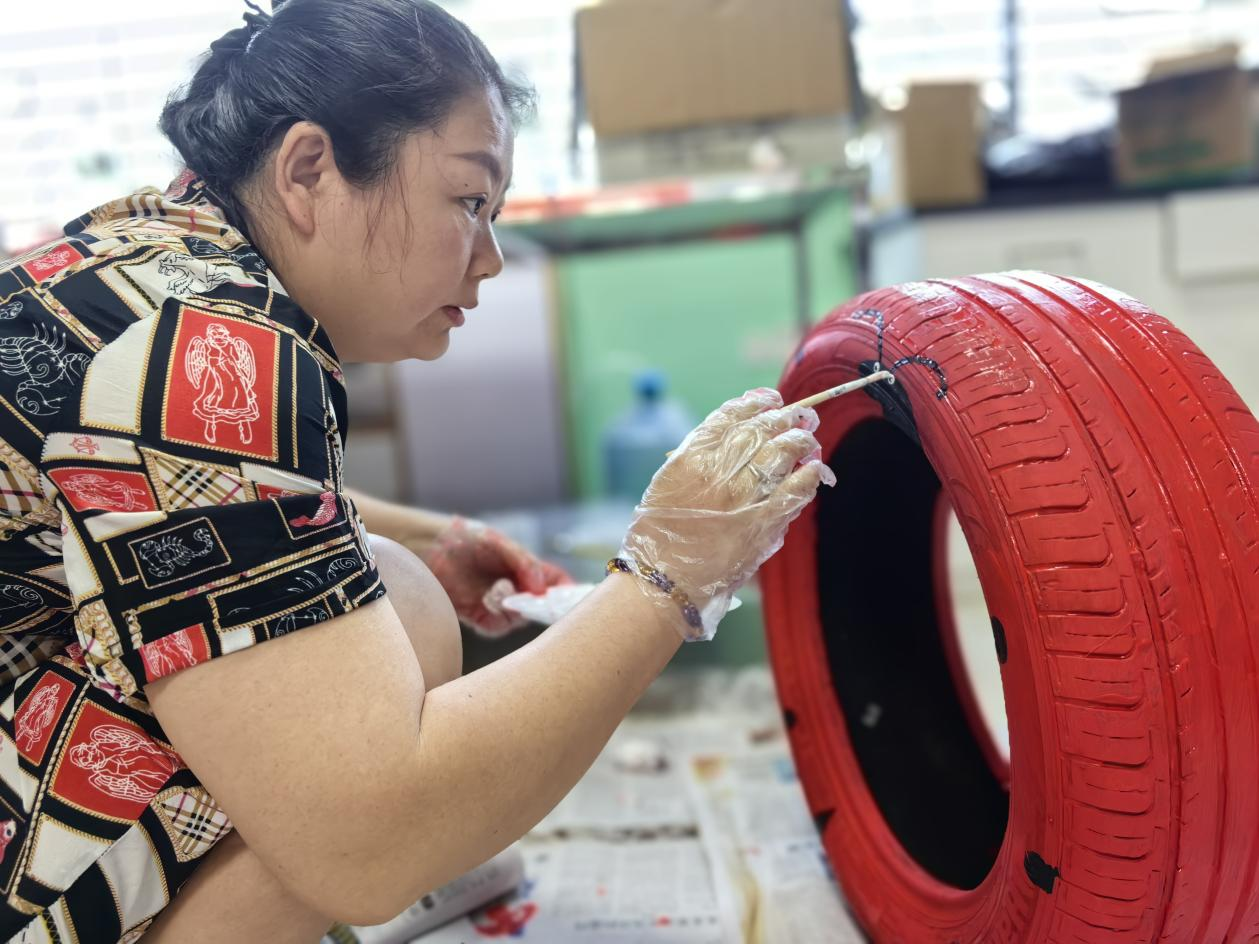 活动现场,活动现场,工作人员为青工们准备了颜料和画笔,并现场指导作画,青工们两人一组,一会凝神构思,一会挥笔作画,每一笔、每一画都充满了青春的激情与活力。随着时间推移,一个个色彩斑斓、主题鲜明的轮胎展现在大家面前。社区居民表示:“能够在工作之余参加到社区的文化活动,近距离感受艺术,让平凡的日子变得有趣。”