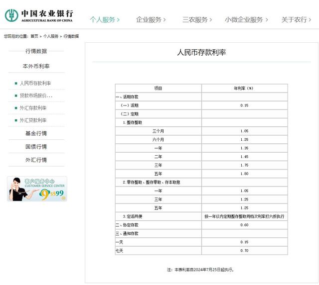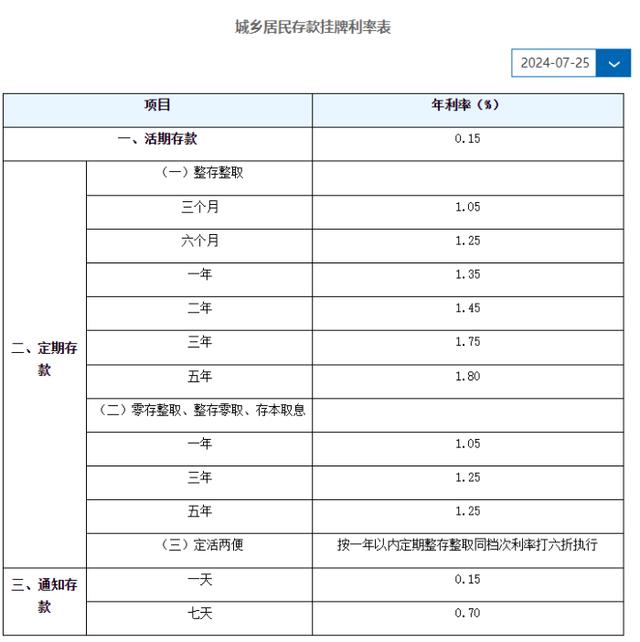 7月25日,农业银行官网显示,该行同样全面下调存款利率。其中,三个月、六个月、一年期整存整取定存利率均下调10个基点,下调至1.05%、1.25%、1.35%。二年期、三年期、五年期利率分别下调20个基点,下调至1.45%、1.75%、1.80%。