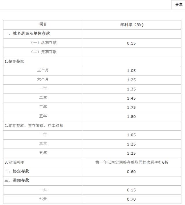 三个月、半年期、一年期、二年期、三年期、五年期整存整取定存利率分别由1.15%、1.35%、1.45%、1.65%、1.95%、2.0%下调至1.05%、1.25%、1.35%、1.45%、1.75%、1.8%。