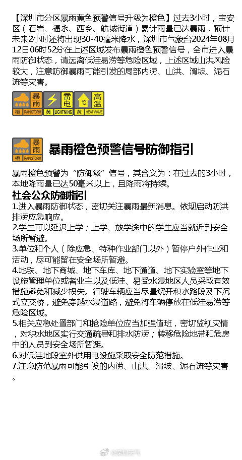 过去3小时,宝安区(石岩、福永、西乡、航城街道)累计雨量已达暴雨,预计未来2小时还将出现30-40毫米降水,深圳市气象台2024年08月12日06时52分在上述区域发布暴雨橙色预警信号,全市进入暴雨防御状态,请远离低洼易涝等危险区域,上述区域山洪风险较大,注意防御暴雨可能引发的局部内涝、山洪、滑坡、泥石流等灾害。